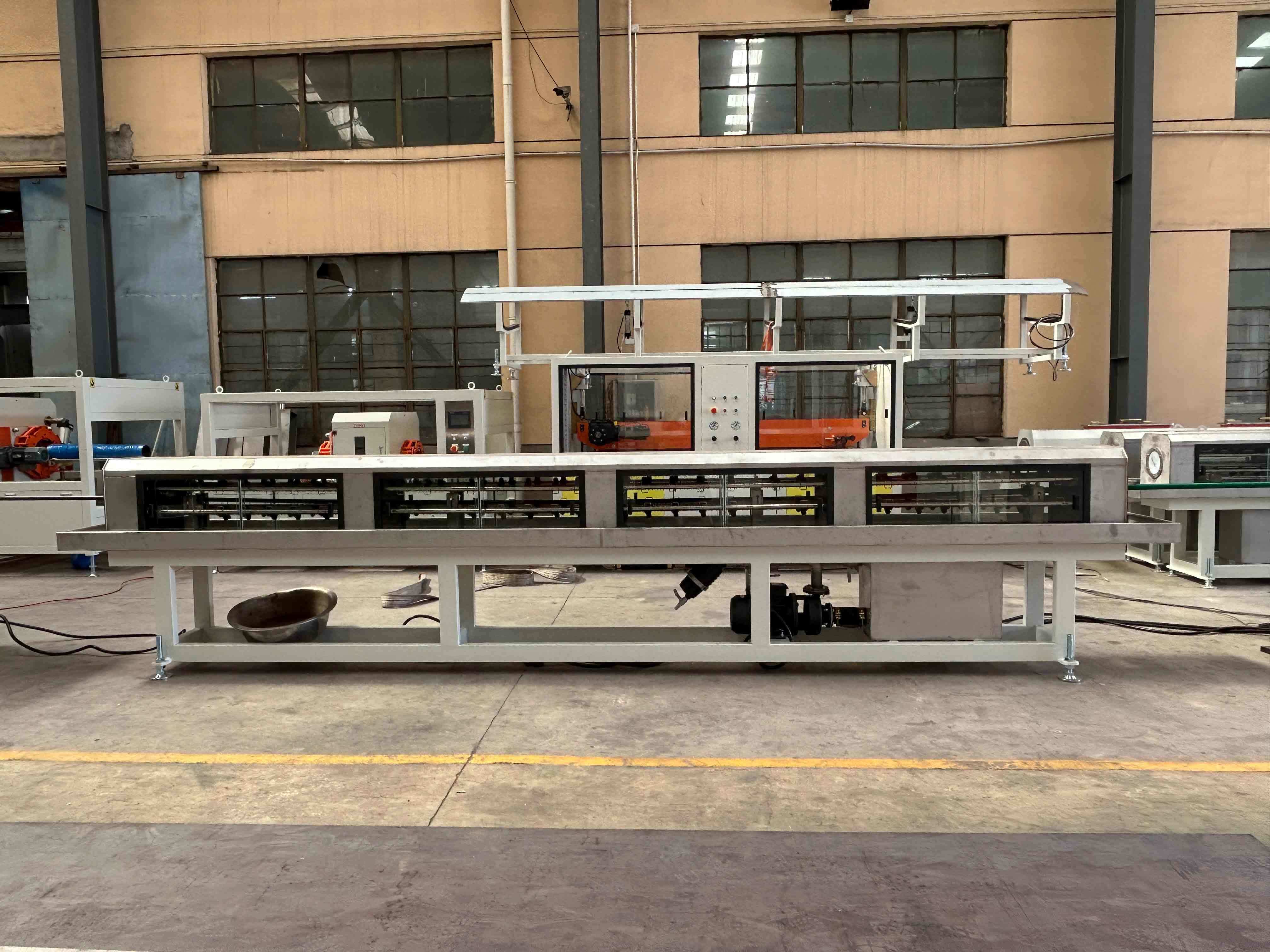 녹은 플라스틱은 파이프/프로필을 형성하기 위해 도형 머리로 통과하고, 정밀한 크기와 냉각을 위해 진공 캘리브레이션 탱크에 들어갑니다.