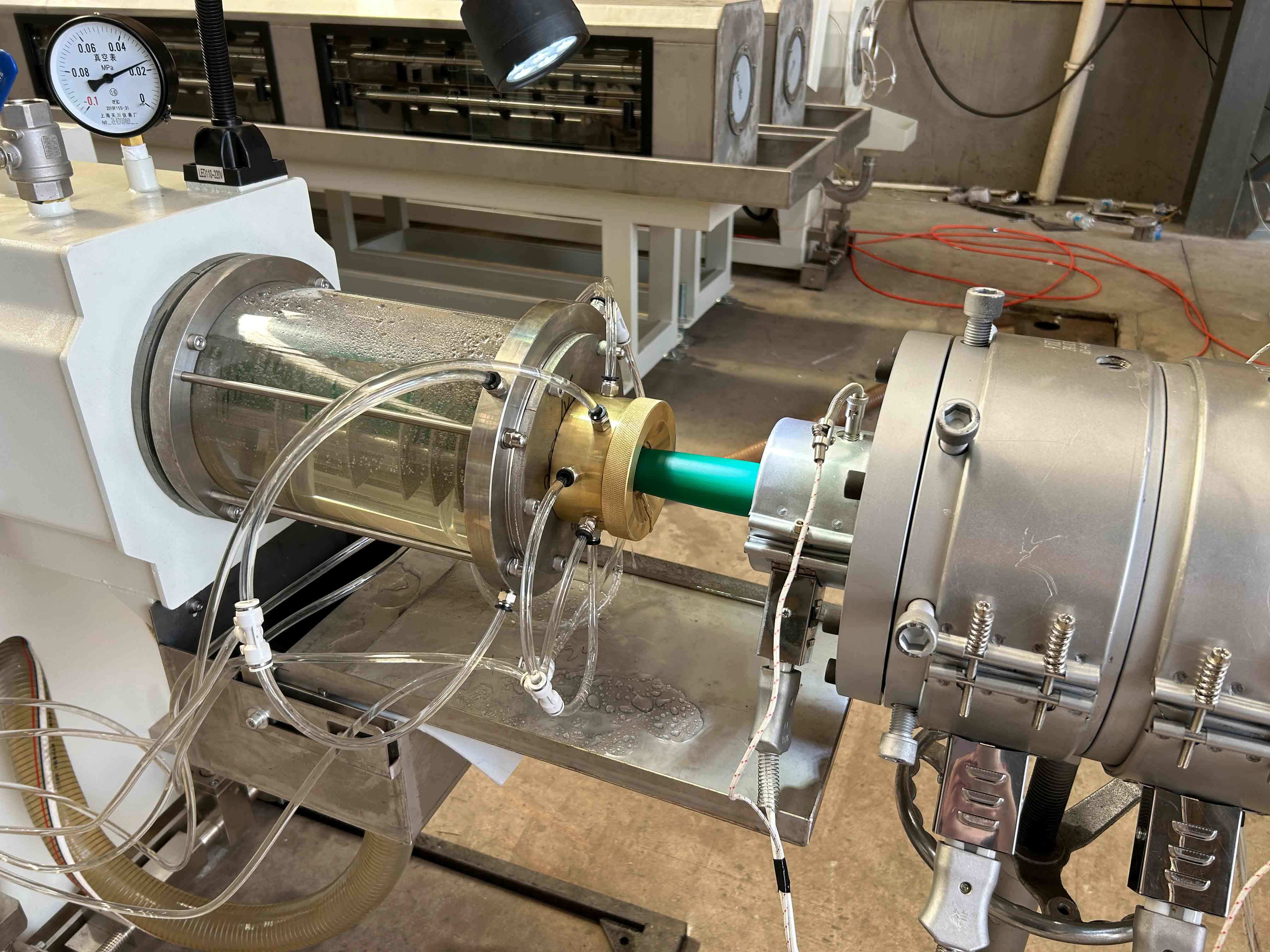 파이프는 진공 보정 탱크에 들어가 직경과 벽 두께를 안정화합니다.