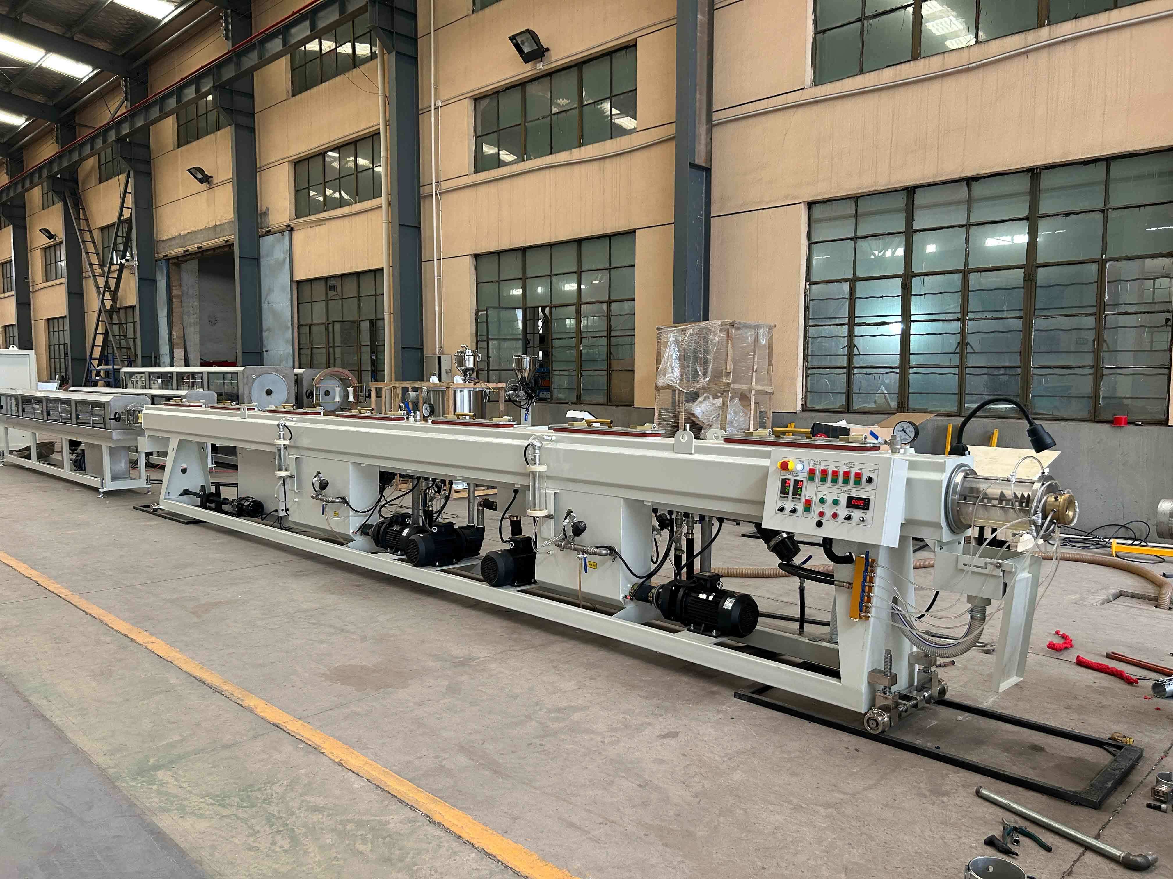 로더 → 건조기 → 단일 스크류 압출기 → 금형 → 진공 및 분무 냉각 탱크 → 인취 → 절단기/와인더 → 파이프 스태커