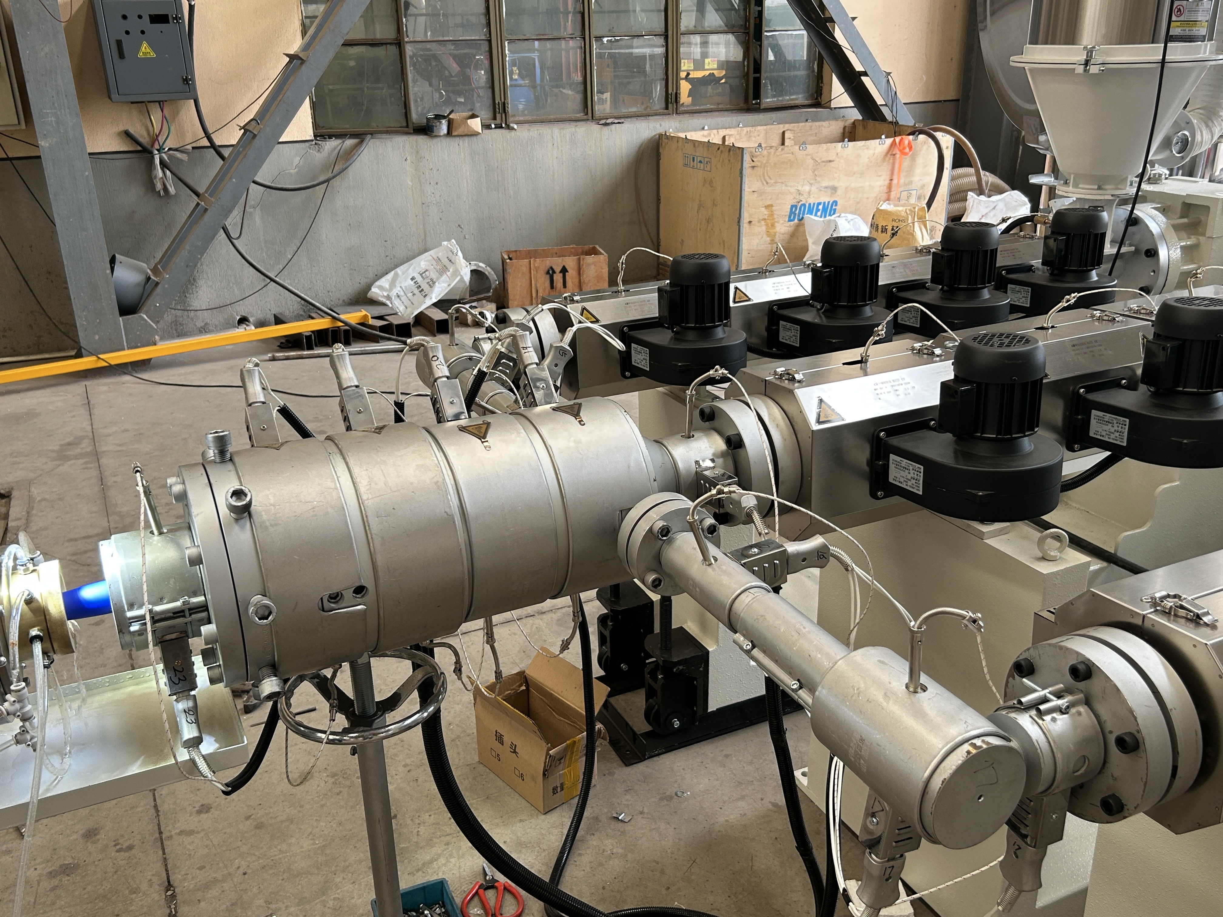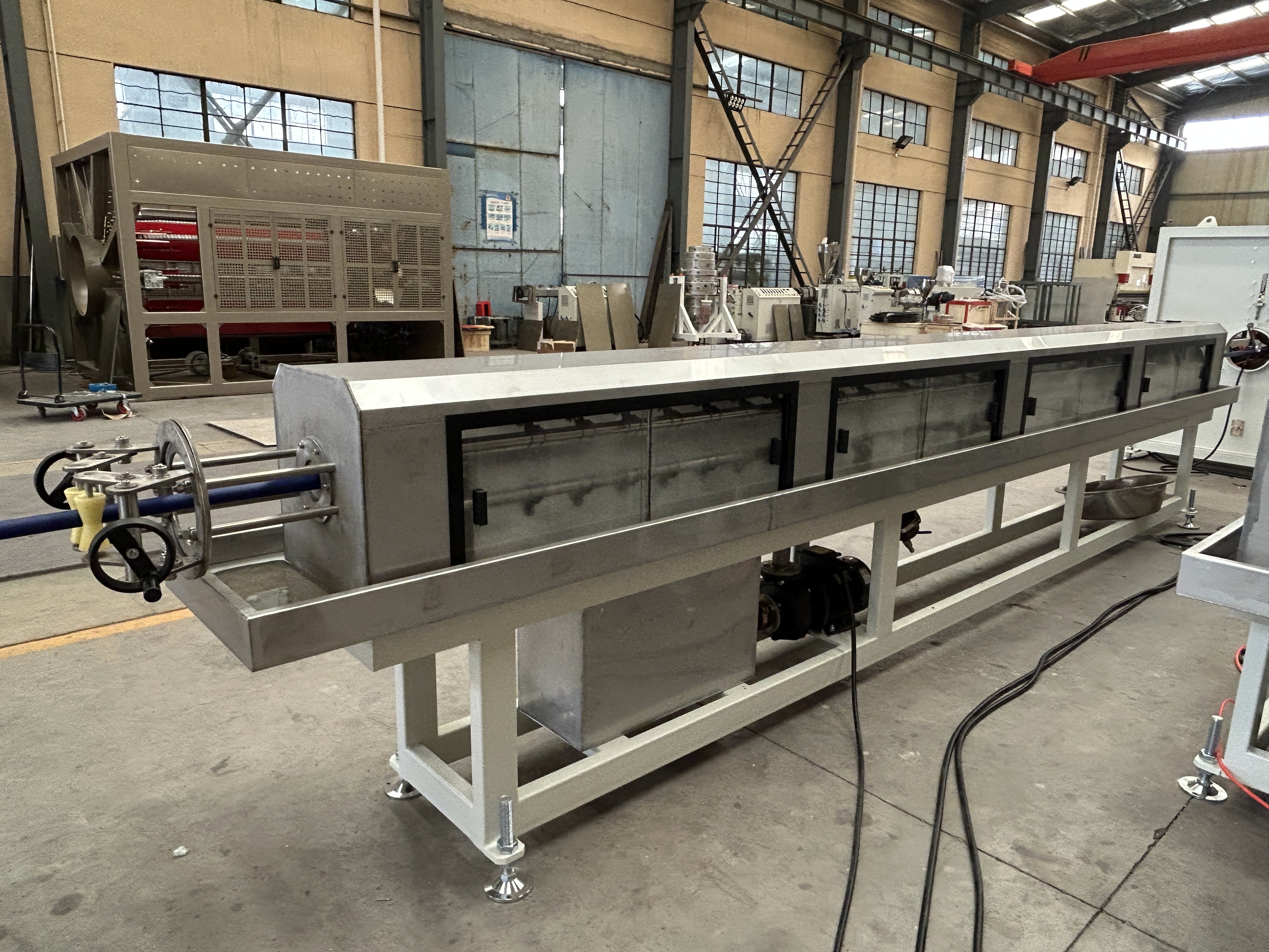 녹은 플라스틱은 파이프/프로필을 형성하기 위해 도형 머리로 통과하고, 정밀한 크기와 냉각을 위해 진공 캘리브레이션 탱크에 들어갑니다.