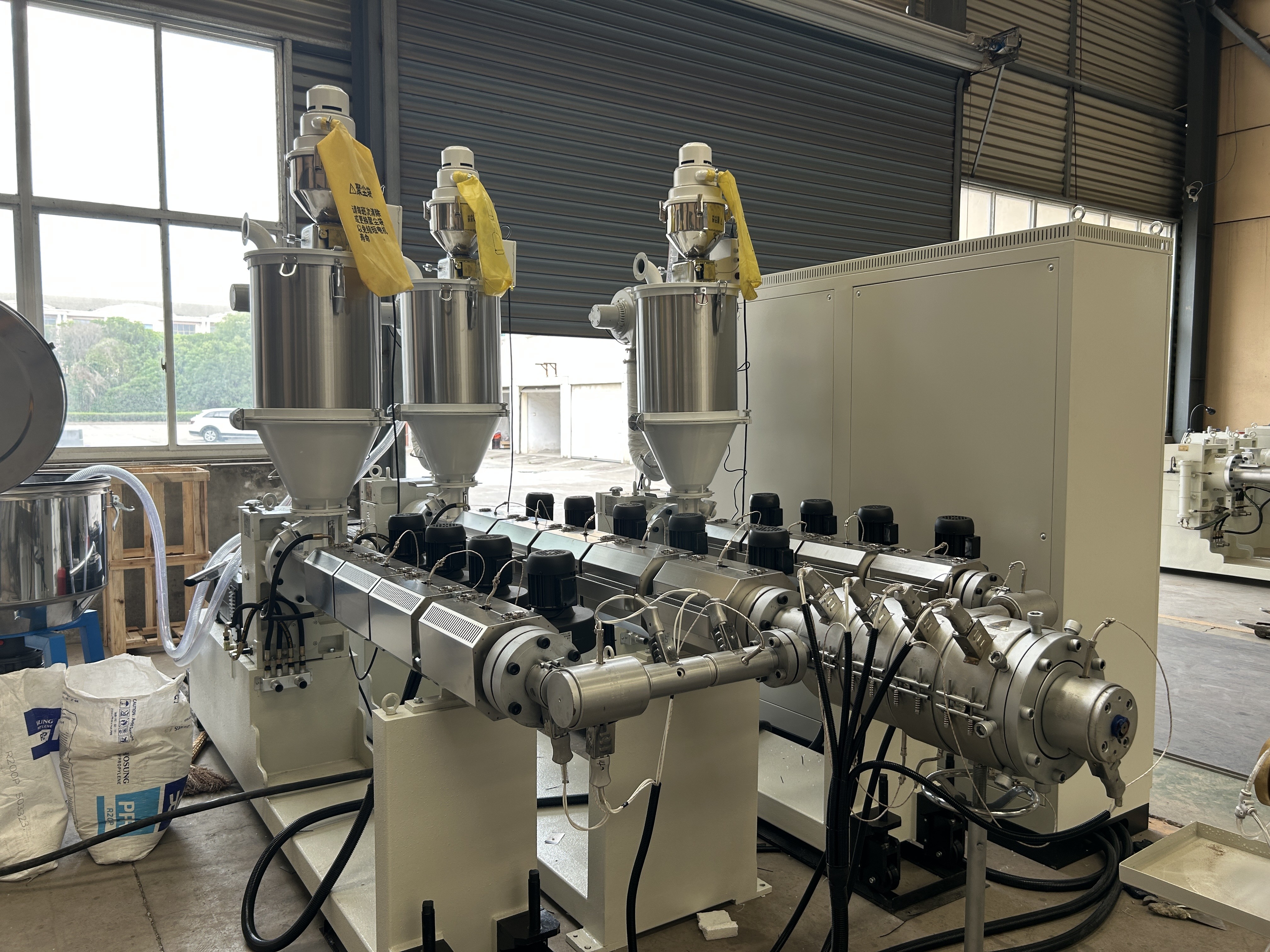 원료 (PPR/PVC 펠릿, 첨가물) 는 자동으로 홉퍼에 공급되고 균일하게 혼합됩니다.