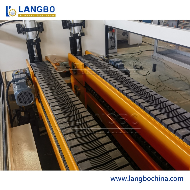 PVC 파우더 + 첨가물 → 혼합 → 스프링 공급 → 쌍 나사 추출기 → 폼과 캘리브레이터 → 진공 형성 기계 → 철거 기계 → 절단 기계 → 스택.