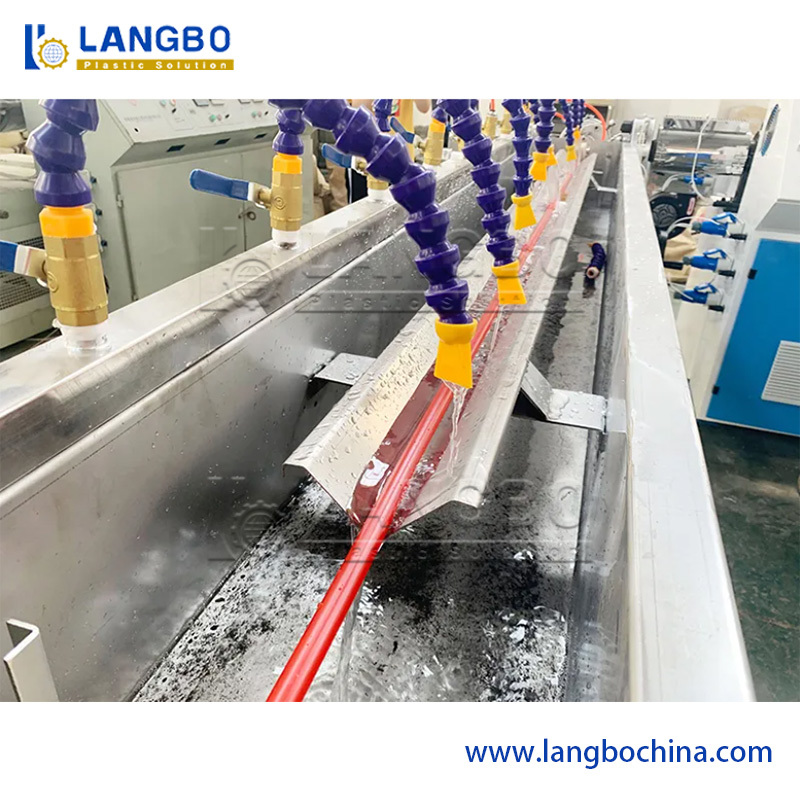 4미터 길이의 수조는 생산된 파이프가 냉각수 분사로 냉각되고 성형되도록 합니다.