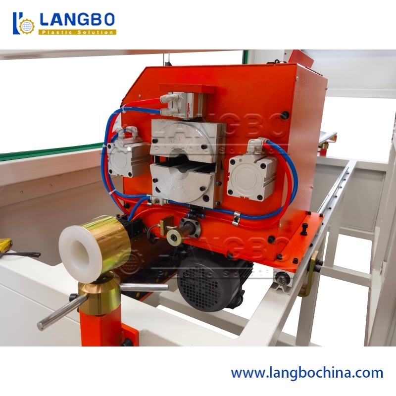 The pipe cutter machine cuts PE pipe to the desired length programed into the HMI.